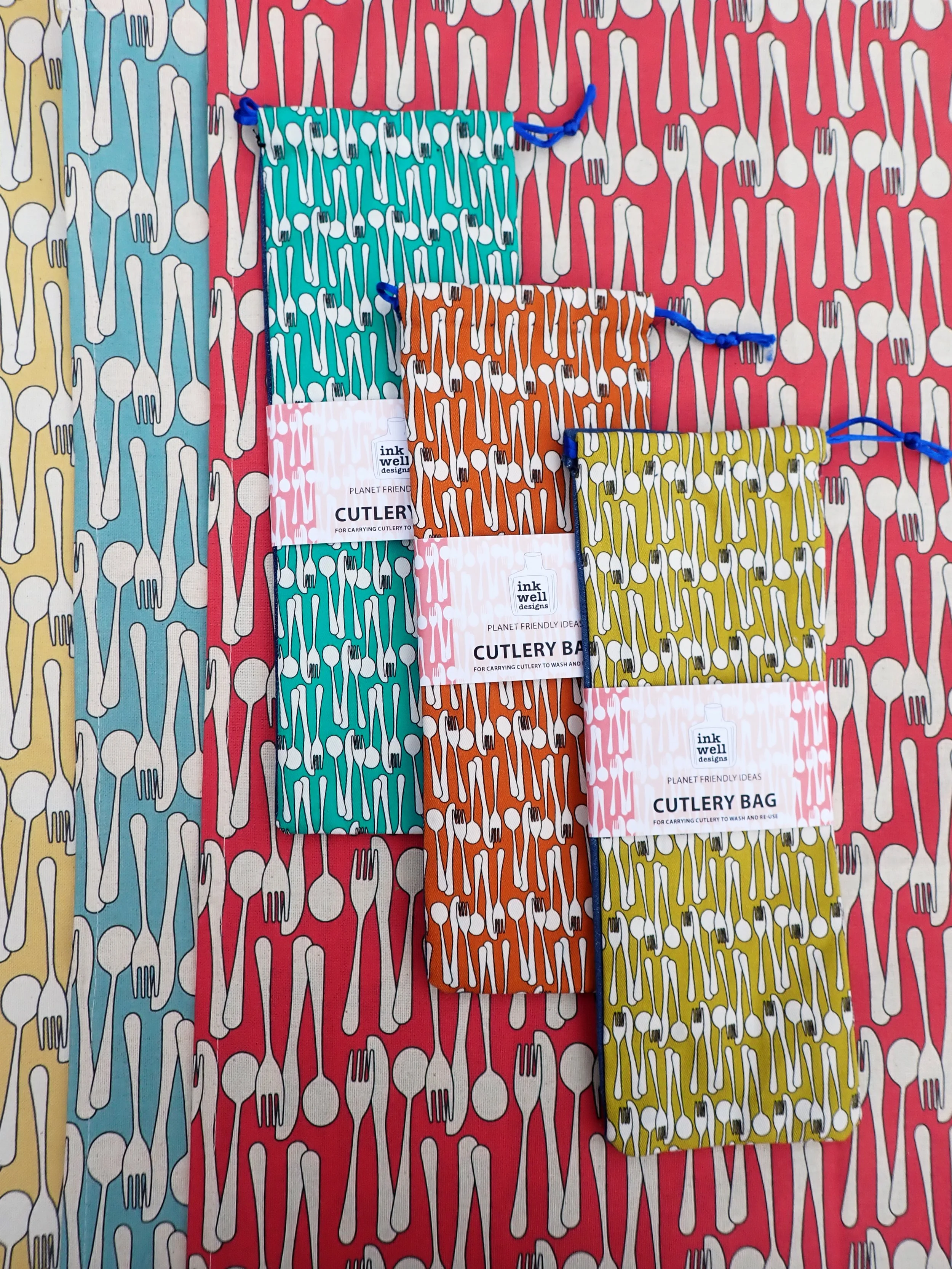 Carry your own cutlery to avoid using throwaway alternatives when you’re on the move. These handmade lined patterned bags are made from Nicola’s ‘Cutlery’ pattern printed on organic cotton. Available in three bright colours: Lemon, Aqua and Tangerine.