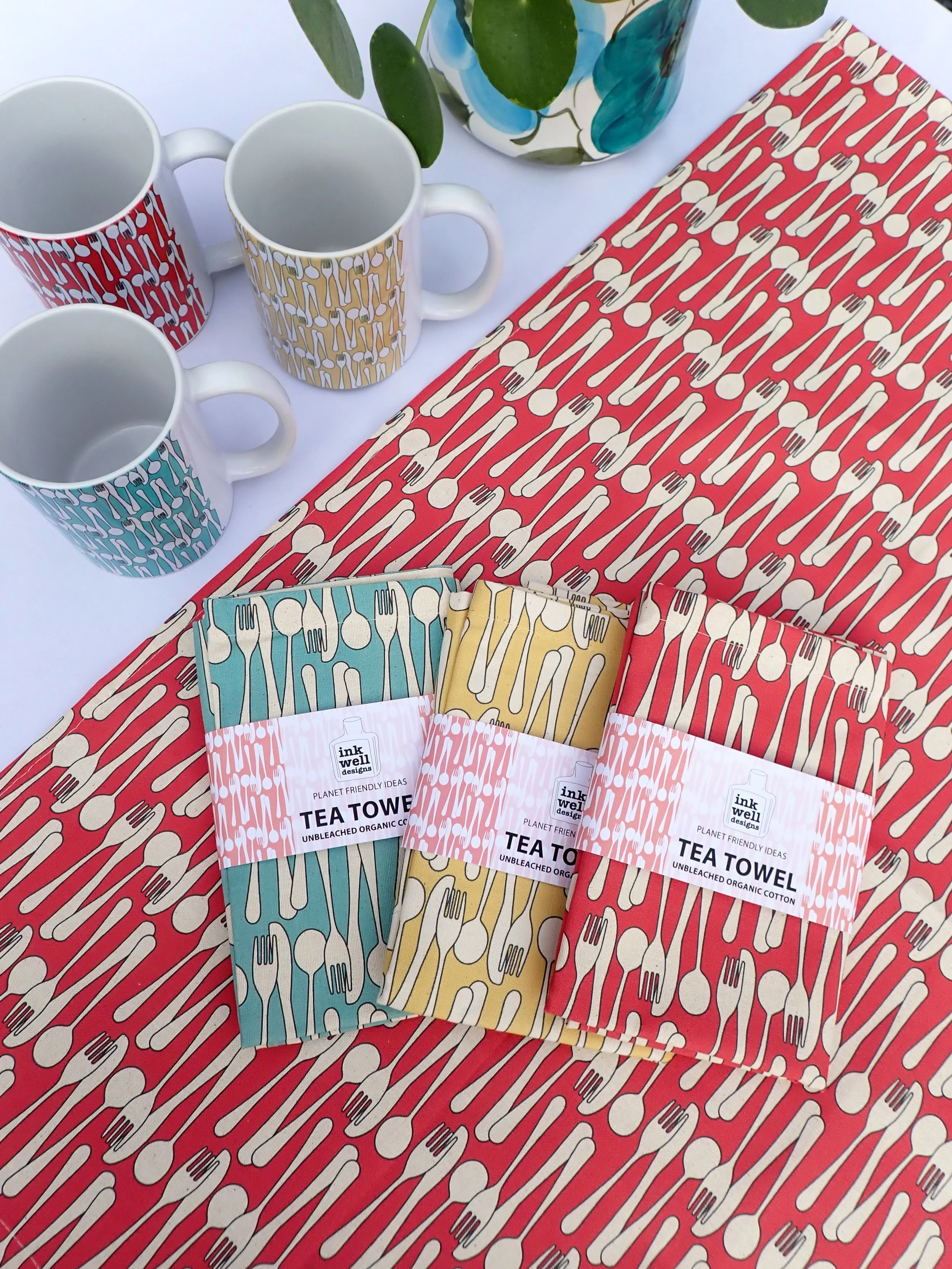 Unbleached, soft and absorbent organic cotton tea towels in Nicola’s popular ‘Cutlery’ pattern will brighten up your kitchen. Kind to your skin as well as the planet these are available in 3 pretty colourways: